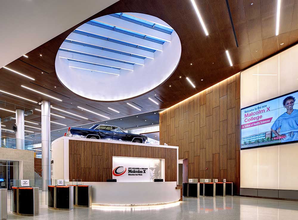 Landcross Vinterio Walnut Classic used for wood walls surfaces and as wood veneer on the millwork, desks/server counters.
