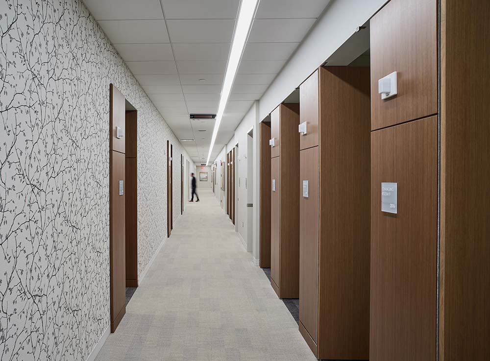 Landcross Linea American Walnut used as surface for changing rooms, wood doors and cabinets.